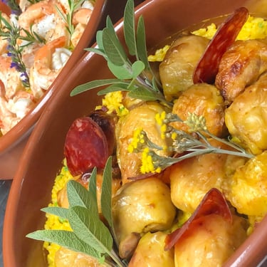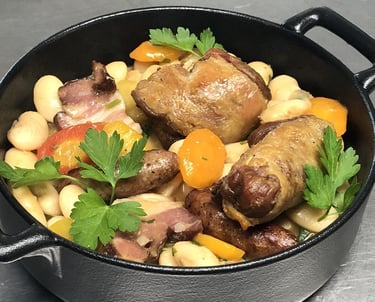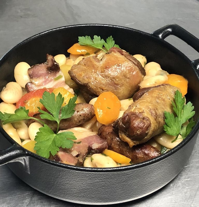 Cassoulet, Chou farci, Choucroute, Coq au vin, Paella, Risotto, Pot au feu, Bourguignon…… le tout réalisé par mes soins en agrémentant de petites touches de modernité pour vos yeux et votre palet.