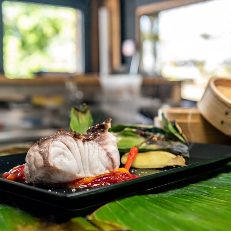 Pour agrémenter la saveur de ce poisson cuit délicatement à la vapeur, voici la recette du rougail mangue du Chef Colé : oignon rouge, ail, citron jaune, mangue fraîche et piment. Pour la garniture, c’est le parfum de la feuille de bananier grillée qui vient donner au riz une saveur exceptionnelle.