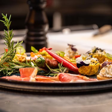 Une large sélection à définir ensemble s’offre à vous : poisson, viande, légumes, agrémenté d’épices, de parfums différents, d’aromates et herbes de notre jardin. La découpe sur place de jambon Ibérique est possible pour une animation culinaire conviviale.