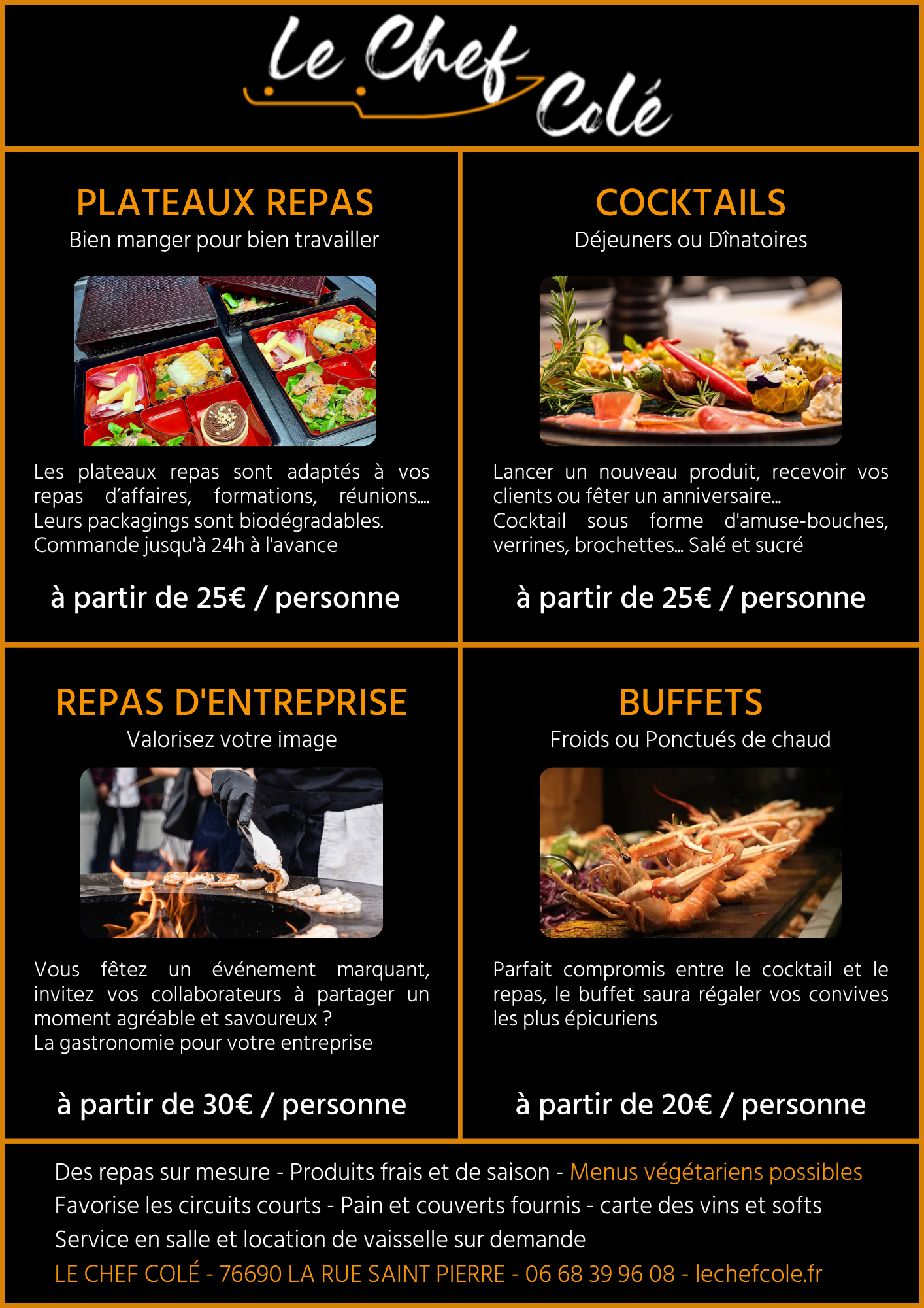 Les Plateaux repas du Chef Colé sont réalisés avec des produits frais de saison. Adaptés à vos repas d'affaires, formations